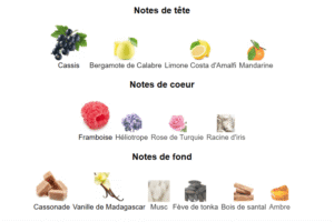 - النفحات العليا: الكشمش الأسود، برغموت كالابريا، ليمون ساحل أمالفي، واليوسفي.